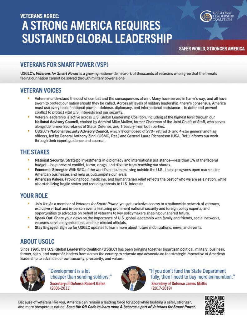 • Speak Out: Share your views on the importance of U.S. global leadership with family and friends, social networks, veterans service organizations, and our elected officials.