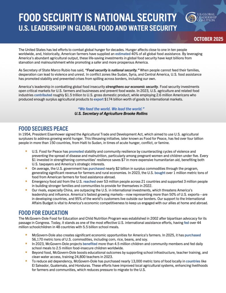 The United States has led efforts to combat global hunger for decades. Hunger affects close to one in ten people worldwide, and, historically, American farmers have supplied an estimated 40% of all global food assistance. By leveraging America’s abundant agricultural output, these life-saving investments in global food security have kept billions from starvation and malnourishment while promoting a safer and more prosperous America.