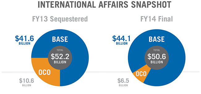 Overall, the total FY14 International Affairs appropriation, including the Overseas Contingency Operations (OCO) and the international food aid funding in the Agriculture bill, comes to $50.6 billion – about 3.1% ($1.6 billion) below current levels. The reason for the overall cut in the International Affairs Budget is a $4.1 billion (-39%) reduction for OCO, the account that largely funds U.S. support for the Frontline states of Afghanistan, Pakistan, and Iraq. As American forces withdraw from Afghanistan, the demands for OCO funding are declining.